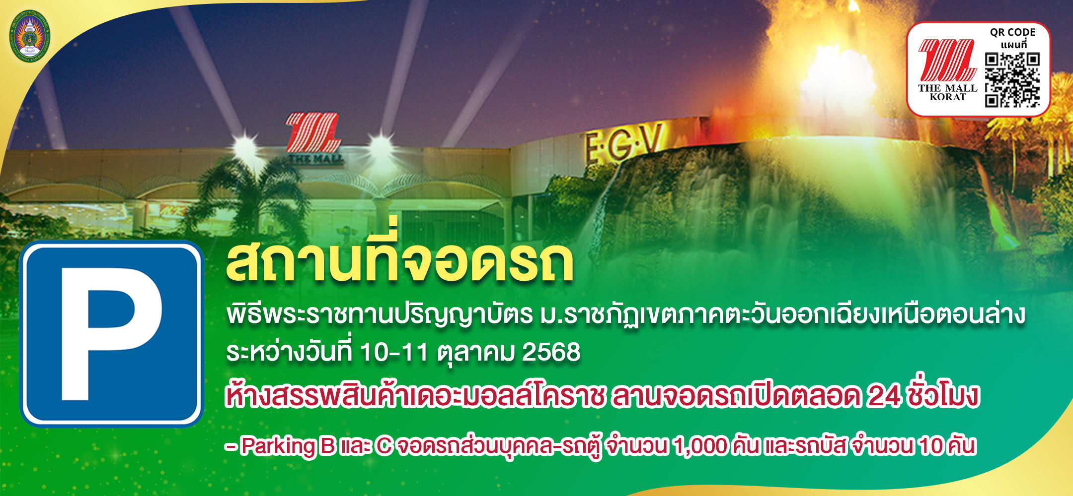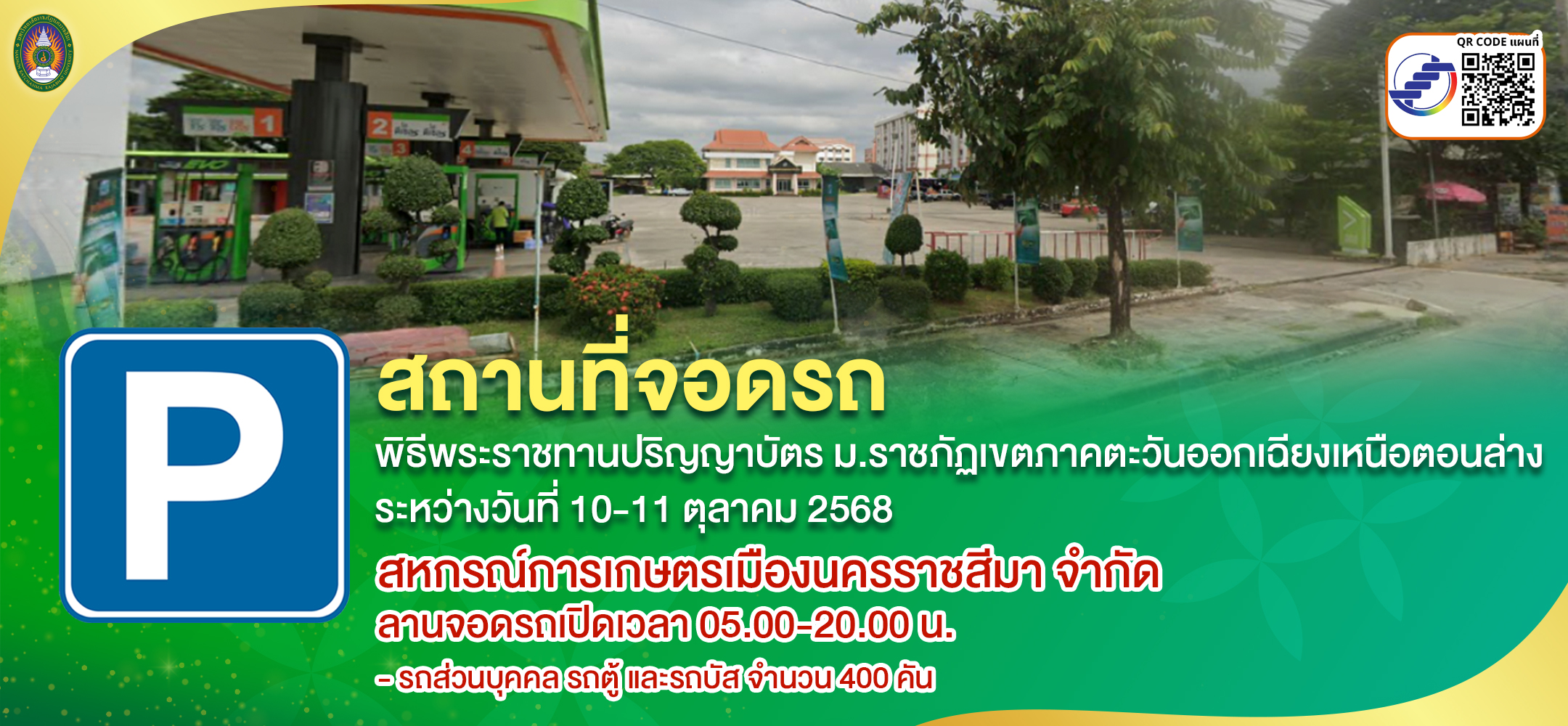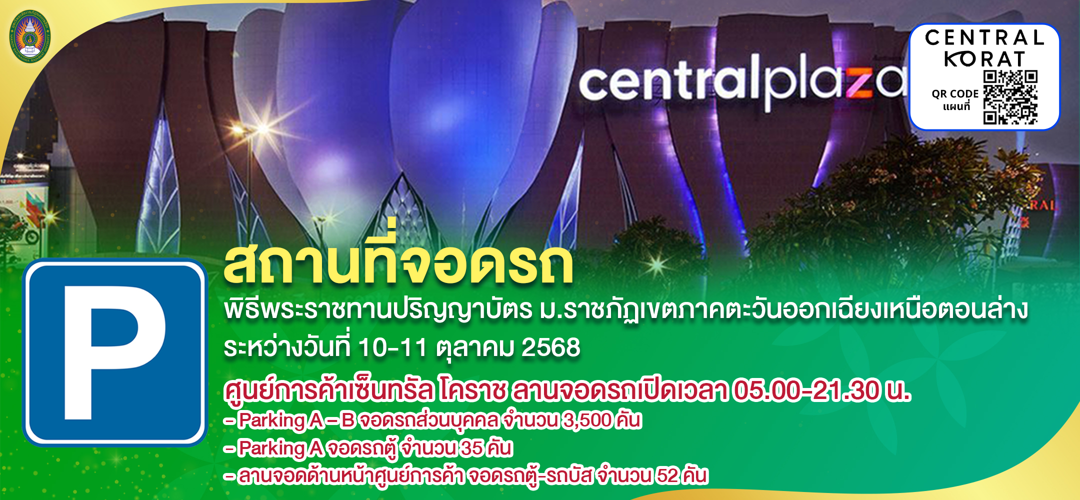 มหาวิทยาลัยราชภัฏนครราชสีมา จะจัดพิธีพระราชทานปริญญาบัตร ประจำปีการศึกษา 2566 มหาวิทยาลัยราชภัฏเขตภาคตะวันออกเฉียงเหนือตอนล่าง ระหว่างวันที่ 10-11 ตุลาคม 2568 ณ หอประชุมราชภัฏรังสฤษฏ์ มหาวิทยาลัยราชภัฏนครราชสีมา จึงขอแจ้งสถานที่จอดรถ ทั้งนี้เพื่อให้การจัดเตรียมสถานที่และเพื่อให้การดำเนินงานเป็นไปด้วยความเรียบร้อย จึงขอความร่วมมือบัณฑิต คณาจารย์ บุคลากร นักศึกษา และผู้มาแสดงความยินดีกับบัณฑิต ดังนี้