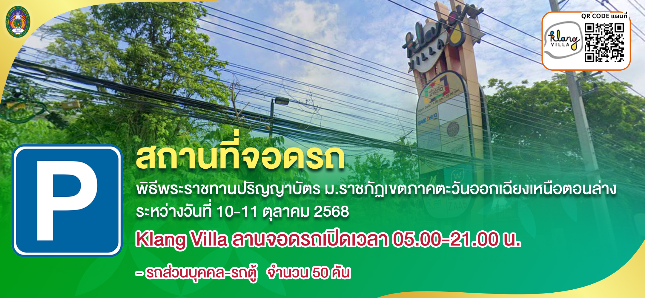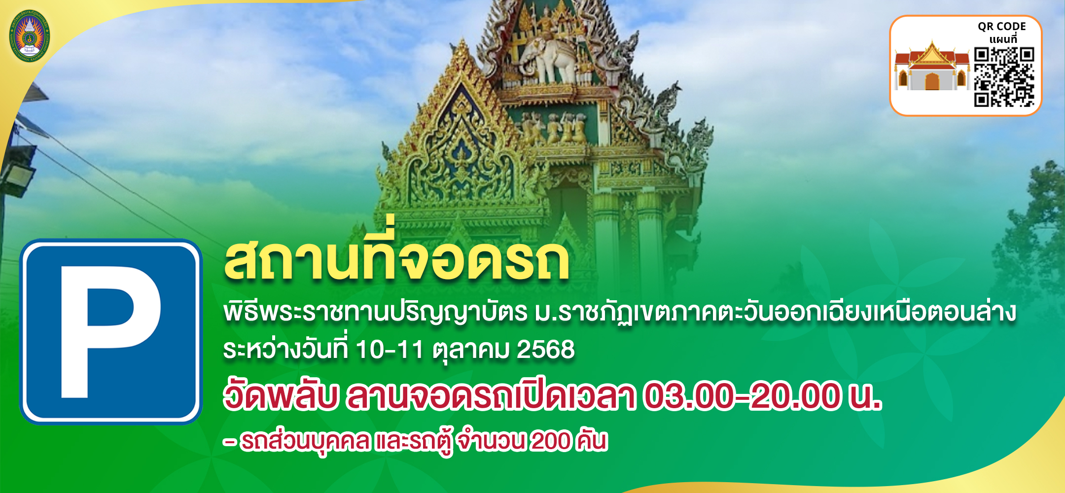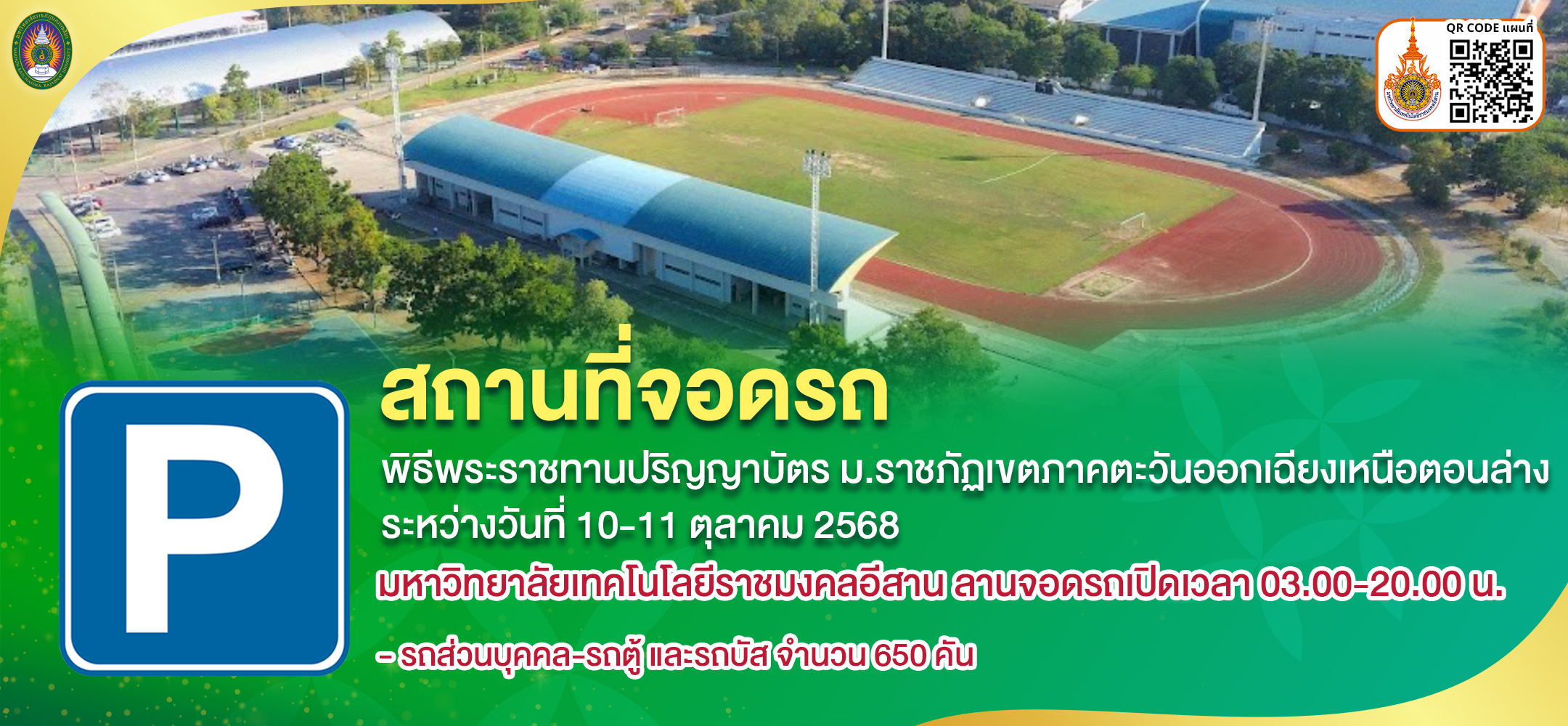 มหาวิทยาลัยราชภัฏนครราชสีมา จะจัดพิธีพระราชทานปริญญาบัตร ประจำปีการศึกษา 2566 มหาวิทยาลัยราชภัฏเขตภาคตะวันออกเฉียงเหนือตอนล่าง ระหว่างวันที่ 10-11 ตุลาคม 2568 ณ หอประชุมราชภัฏรังสฤษฏ์ มหาวิทยาลัยราชภัฏนครราชสีมา จึงขอแจ้งสถานที่จอดรถ ทั้งนี้เพื่อให้การจัดเตรียมสถานที่และเพื่อให้การดำเนินงานเป็นไปด้วยความเรียบร้อย จึงขอความร่วมมือบัณฑิต คณาจารย์ บุคลากร นักศึกษา และผู้มาแสดงความยินดีกับบัณฑิต ดังนี้