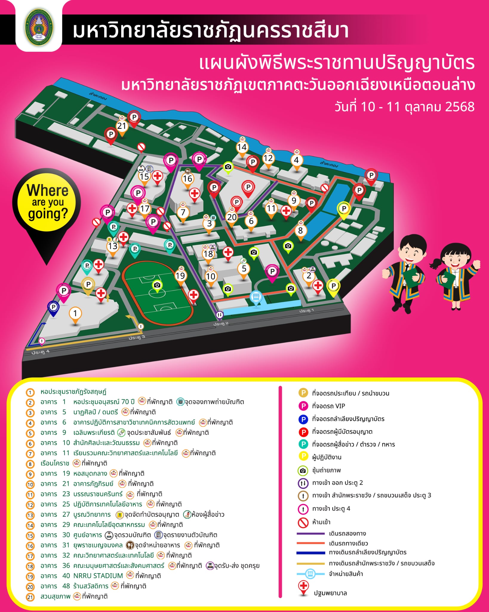 - ประตู 4 ทางเดินรถลำเลียงปริญญาบัตร เท่านั้น ทั้งนี้ มหาวิทยาลัยราชภัฏนครราชสีมา ได้จัดเตรียมสถานที่จอดรถไว้รองรับบัณฑิต ญาติบัณฑิต และผู้มาแสดงความยินดีกับบัณฑิต ดังนี้